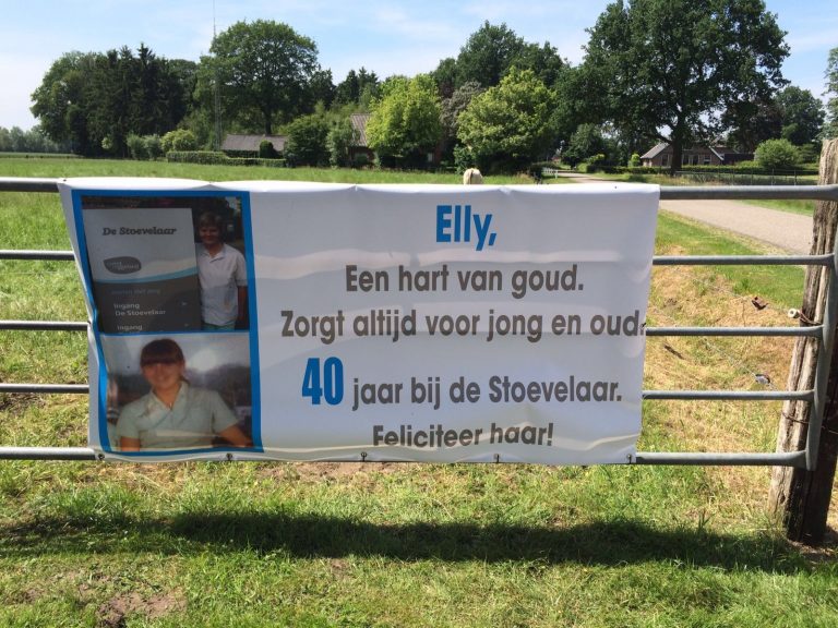 Een prachtig jubileum voor de Hengeveldse Elly Pierik. Ze is 40 jaar werkzaam bij De Stoevelaar in Goor. Ter gelegenheid hiervan kreeg ze een mooi spandoek bij haar huis opgehangen. Elly gefeliciteerd en nog vele mooie jaren toegewenst!