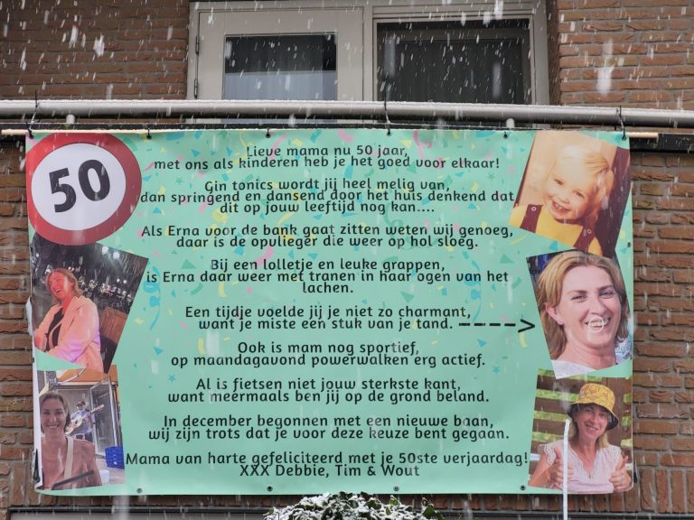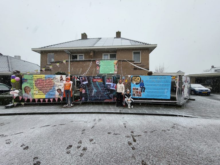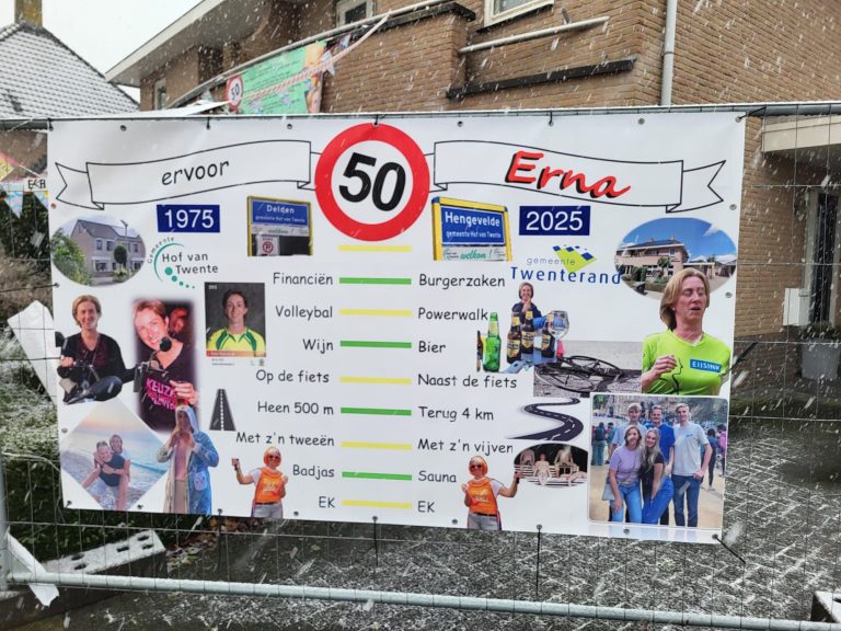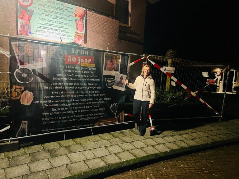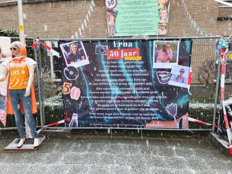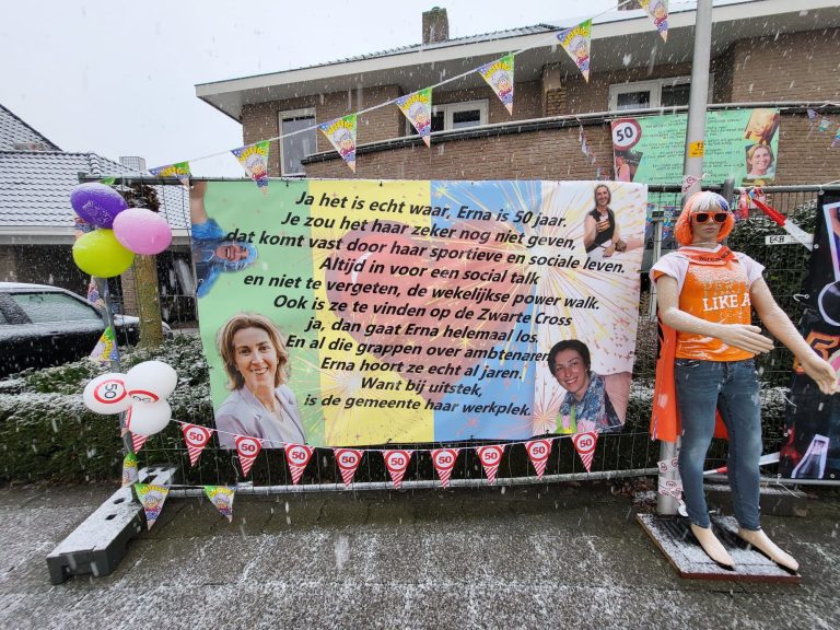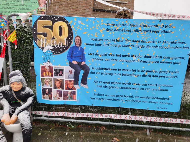 Het is feest aan Het Markslag! Erna Huisstede – Koenderink keert namelijk toe tot de club der vijftigers. De buurt genaamd ‘De Markslagers’ lieten het niet onopgemerkt voorbij gaan en zetten in de ijzige vrieskou een bord! De Marslagers laten dan ook weten: “Remco is niet blij, Erna is er eerder bij. Van harte met je 50ste. De Markslagers!”