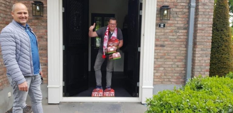 Op de foto's hierboven en onder is te zien dat ze ook in Hengevelde waren, waar Mark Tuinte niet te beroerd was om ook een heerlijke box in ontvangst te nemen van de horeca-afdeling van FC Twente, die een heel goed jaar draaiden, totdat corona roet in het eten gooide.