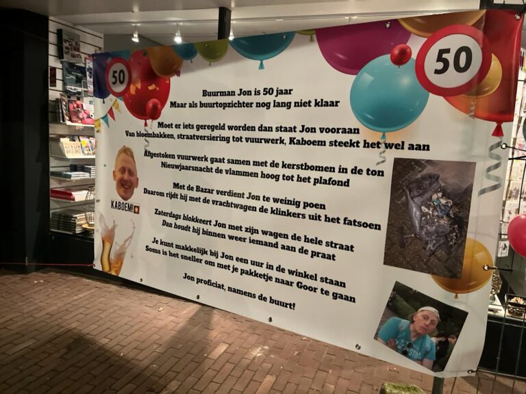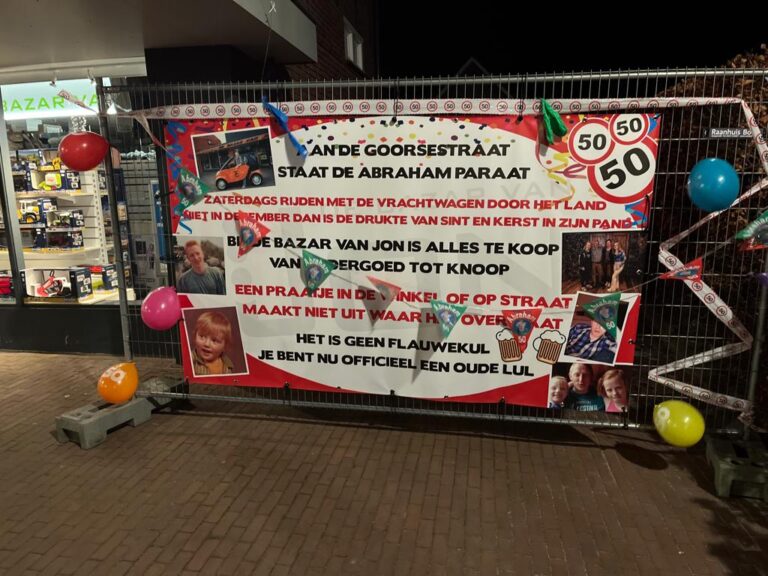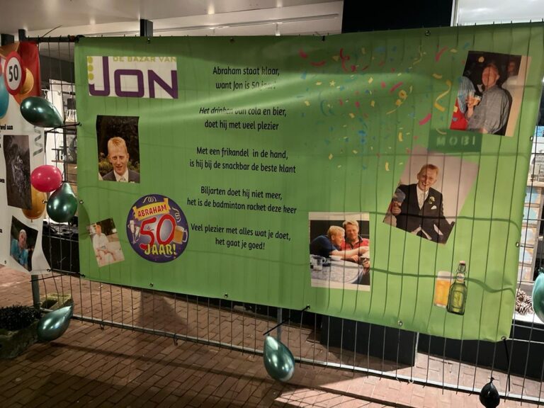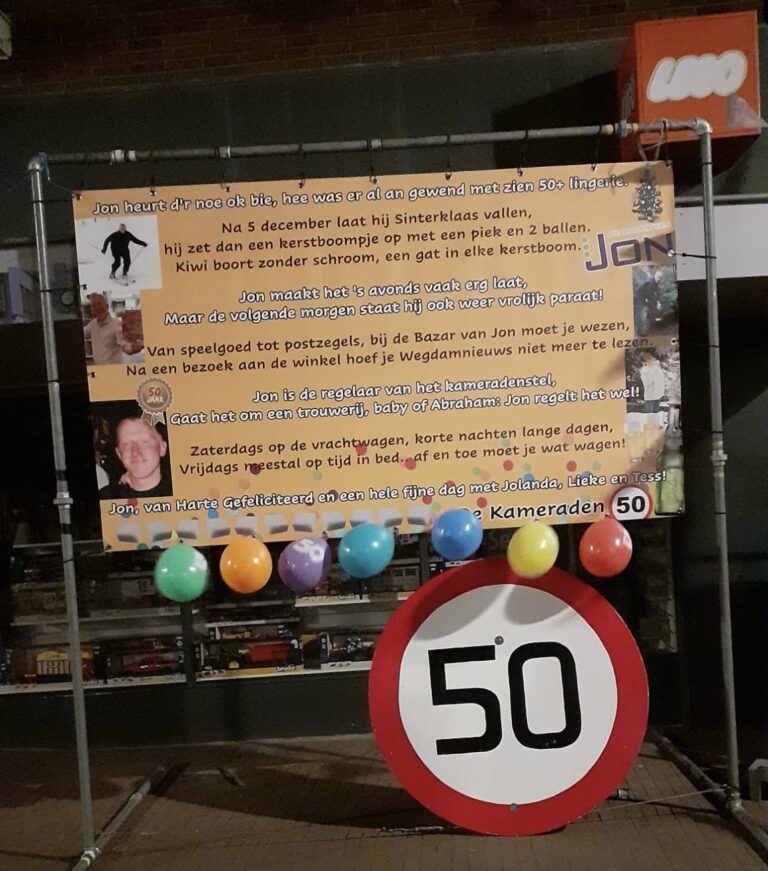 Het is groot feest aan de Hengeveldse boulevard (lees: Goorsestraat), want Jon Klein Breteler is 50 jaar! Hij weet nu waar Abraham de mosterd haalt en kreeg fraaie spandoeken voor woonhuis en winkelpand! Namens misschien wel het gehele dorp…. Van harte gefeliciteerd Jon!