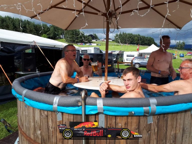 Het jaarlijkse bezoek met de ‘ten Thije bus’ aan de formule 1 gaat ook dit jaar weer naar de Red Bullring in ‘Spielberg bei Knetterfeld’. Het is een bezoek die zijn weerga niet kent! Tussen het Oostenrijkse hooggebergte liggen daar plotseling zo’n 15 Hengeveldenaren met een grote pot bier in een ware hot-tub! Nardus ten Buuren: ”Behalve dat we Max Verstappen komen aanmoedigen, wordt er op tijd en plaats ook een biertje gedronken en een duik in de hot-tub. De groep bestaat uit de vaste groep van 9 man en er zijn 6 gasten. De reis verliep goed, dinsdag om 20.00 uur vertrok de bus en de kleine bus met aanhanger, met daarop het zwembad en brandhout van HEBO voor het verwarmen van de jacuzzi. Vanmiddag gaan we de kwalificatie bekijken, met hopelijk een goed resultaat voor Max en vanavond is er nog een popconcert voor de liefhebbers.