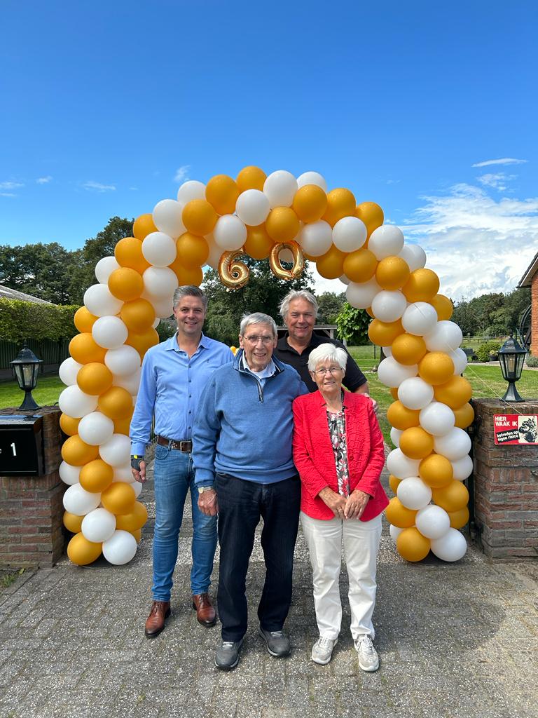 Het is groot feest aan de Wiener Bentelerscheidingsweg tussen Hengevelde en Goor, want Gert Spijkerman en Annie Spijkerman-Menzing zijn 60 jaar getrouwd. Samen met de familie wordt dit uiteraard groots gevierd. Uit het huwelijk kwamen twee kinderen voort. Gerrit woont met zijn vrouw Christel in Harskamp en Christiaan en Sheila wonen met Sanne en Maud naast het echtpaar. Speciaal voor de gelegenheid kwam de burgemeester op bezoek zoals hierboven op de foto te zien is. Speciaal voor deze gelegenheid legden we het echtpaar enkele vragen voor.