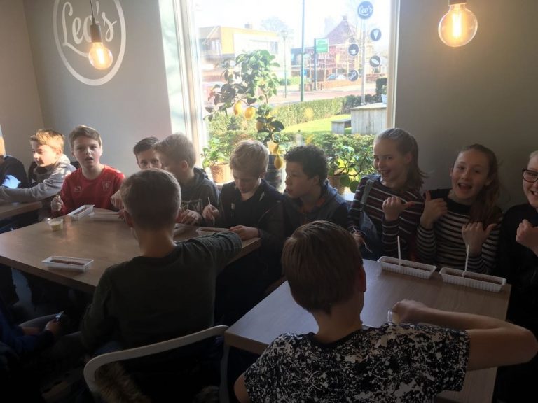 Groep 8 geniet van de prijs die ze gewonnen hebben met de Carnavalsoptocht in Hengevelde.