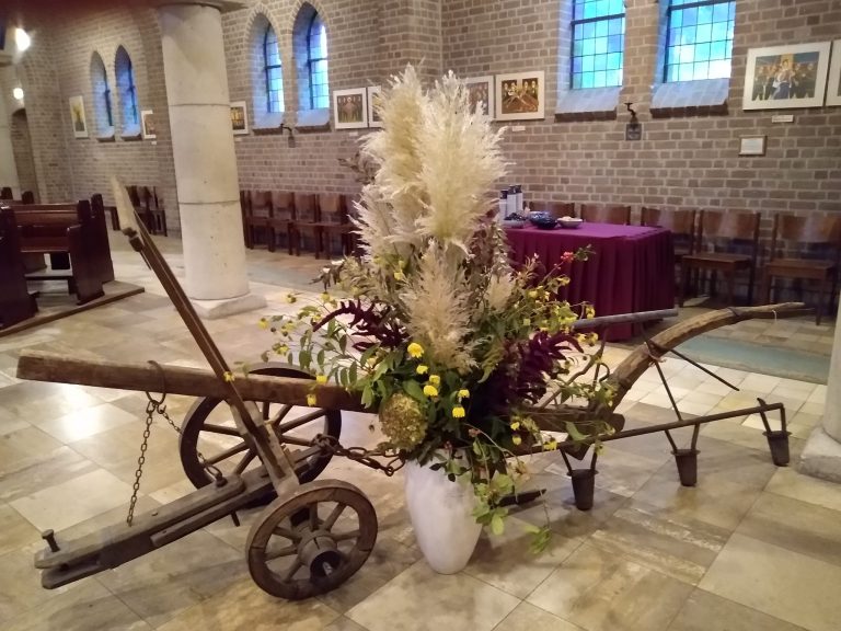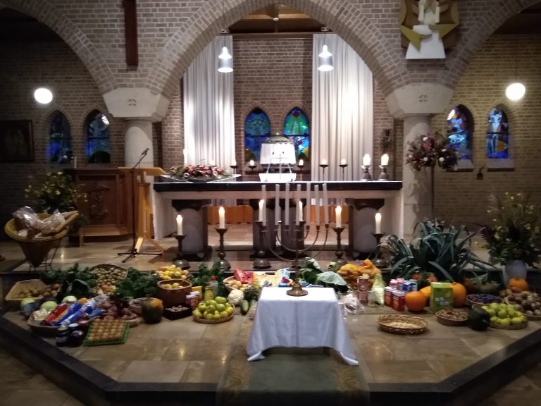 Afgelopen zaterdagavond 2 oktober j.l. vierden we de jaarlijkse oogstdankdag. De kerk was mooi versierd met groenten, fruit, bloemen, graan, aardappelen, levensmiddelen enzovoort. Al deze producten waren door parochianen bijeen gebracht. De opbrengst gaat zoals gewoonlijk weer naar leefgemeenschap “De Wonne” ïn Enschede. Een aantal afgevaardigden van de Wonne waren bij de viering aanwezig. Na afloop was er koffie voor de aanwezigen.