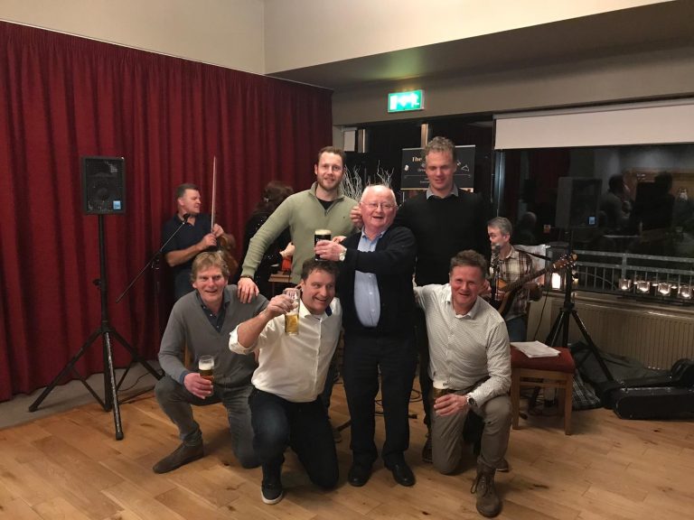 Afgelopen vrijdag trokken John Pierik, Jan Willen Pigge, Jeroen Nijkamp, Brian en Raymond Wegdam de stoute schoenen aan voor een ‘big surprise’ richting het Ierse plaatsje Ballinahown. Daar woont Jimmy Corrigan, al jaren een vertrouwd gezicht in Hengevelde, met name tijdens de Zomerfeesten. De beste man werd vrijdag 70 en daarom werd hij verrast met een bezoekje. Raymond Wegdam: “Het was een bijzondere avond vol met traditionele Ierse muziek, in het clubgebouw van een rugby vereniging! De verrassing was enorm op het moment dat we plotseling bij hem Voorde deur stonden. Aan alles kon je merken; Jimmy is een held hier in de omgeving. Hij treedt vaak op in binnen en buitenland als Ierse zanger en gaf deze avond ook nog even een showtje weg! Het publiek op de banken!”