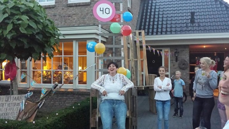 Tot grote hilariteit bij de buren neemt Hilke Brummelhuis plaats in haar traditionele stoel ten faveure van haar 40e verjaardag!