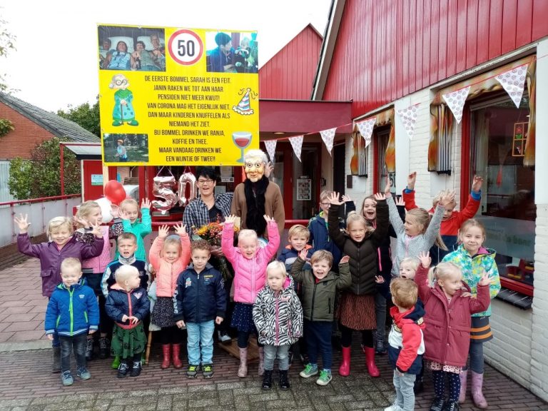 Zondag 11 Oktober was het dan zover! Janin Elkink uit Markelo, werkzaam bij Bommel de Beer, werd 50 jaar. Net als in haar tuin in Markelo, werd ze ook bij bij Bommel de Beer niet vergeten. De eerste Sarah binnen de Bommel de Beer muren is dan ook een feit. Ze werd binnen gehaald met haar "ontvoerde" sarah uit de tuin, wat bij veel kinderen heel wat vragen op riep. Zoals wie is die vouw?! Maar uiteraard was er ook tijd voor kadootjes . Het OC kwam op bezoek met een mooie grote bos bloemen en de kinderen hadden een super leuke keukenschort gemaakt, voor kokkie Janin. Maarja, vandaag was het niet koken in de keuken maar lekker genieten van de patatjes van Yess! Wat hebben de kids gesmuld, en Janin heeft super genoten van deze feestdag. Janin namens alle ouders, kinderen, de redactie en collega's van harte gefeliciteerd!