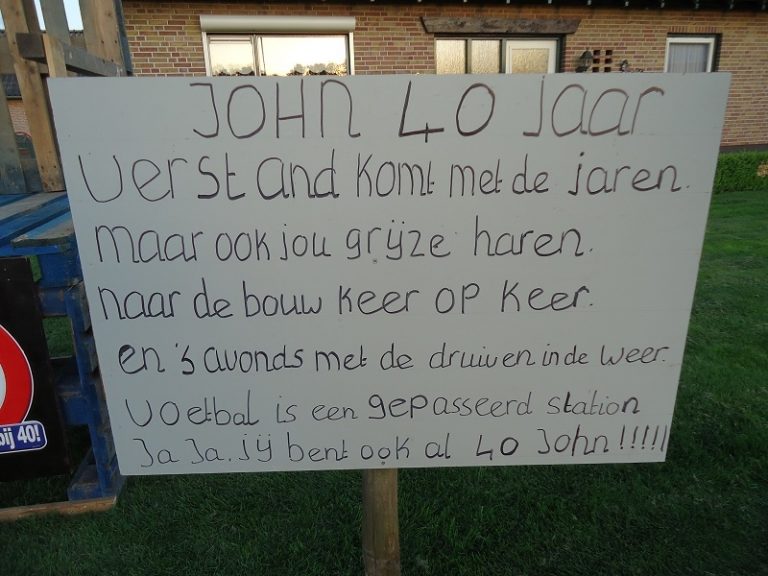 John is vandaag 16 mei 40 jaar geworden. Hij heeft een mooie stoel in de tuin gekregen met bijbehorend bord.