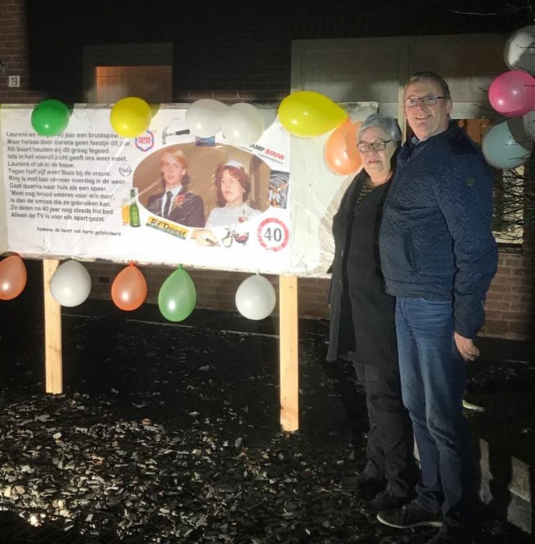 Vandaag zijn Laurens en Riny Beld, woonachtig aan de Bomhof 40 jaar getrouwd. De buurt heeft een mooi bord geplaatst, natuurlijk op gepaste afstand. Laurens is regionaal bekend als handbaltrainer, Riny rijdt dagelijks in haar Ter Doest bus de regio door, zwaaien dus als je haar tegenkomt! Ook namens de redactie van harte proficiat samen!