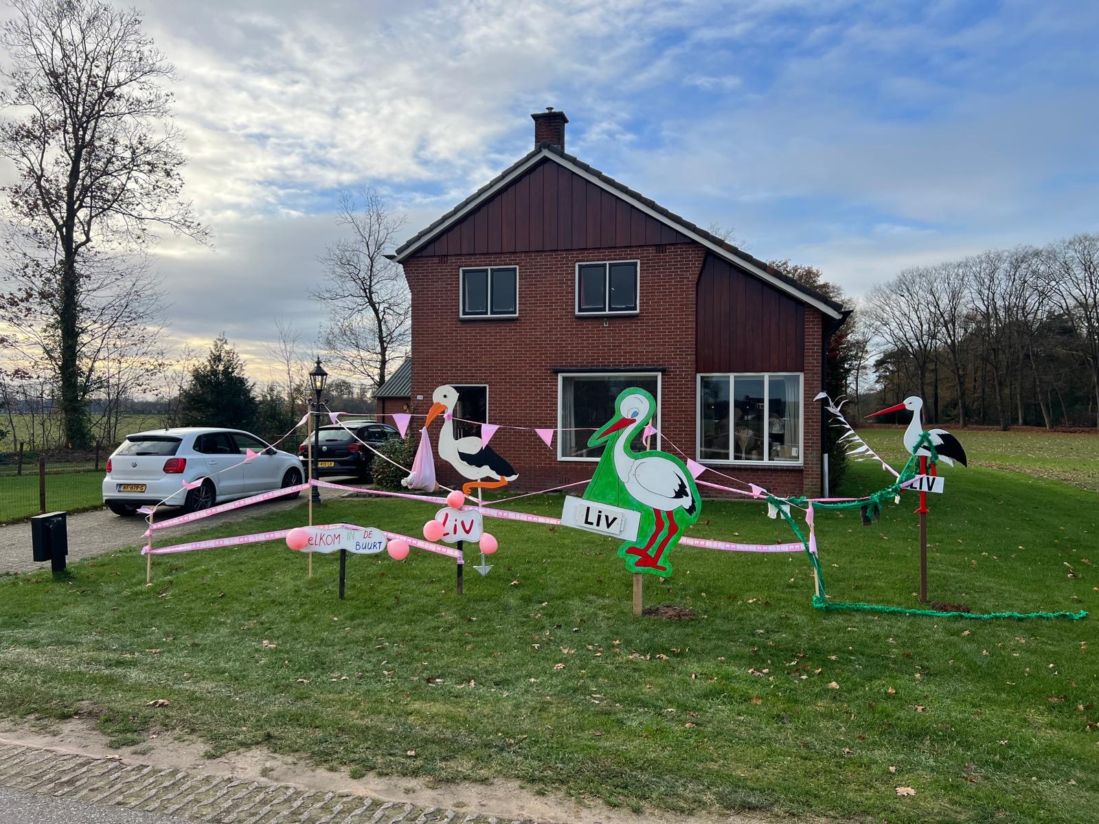 Kasper Put en Rikke Brummelhuis, woonachtig aan de Kinkelerweg net buiten Hengevelde, zijn ouders geworden van hun tweede dochter, Liv. Grote zus June is trots en de tuin is feestelijk versierd met ooievaars!