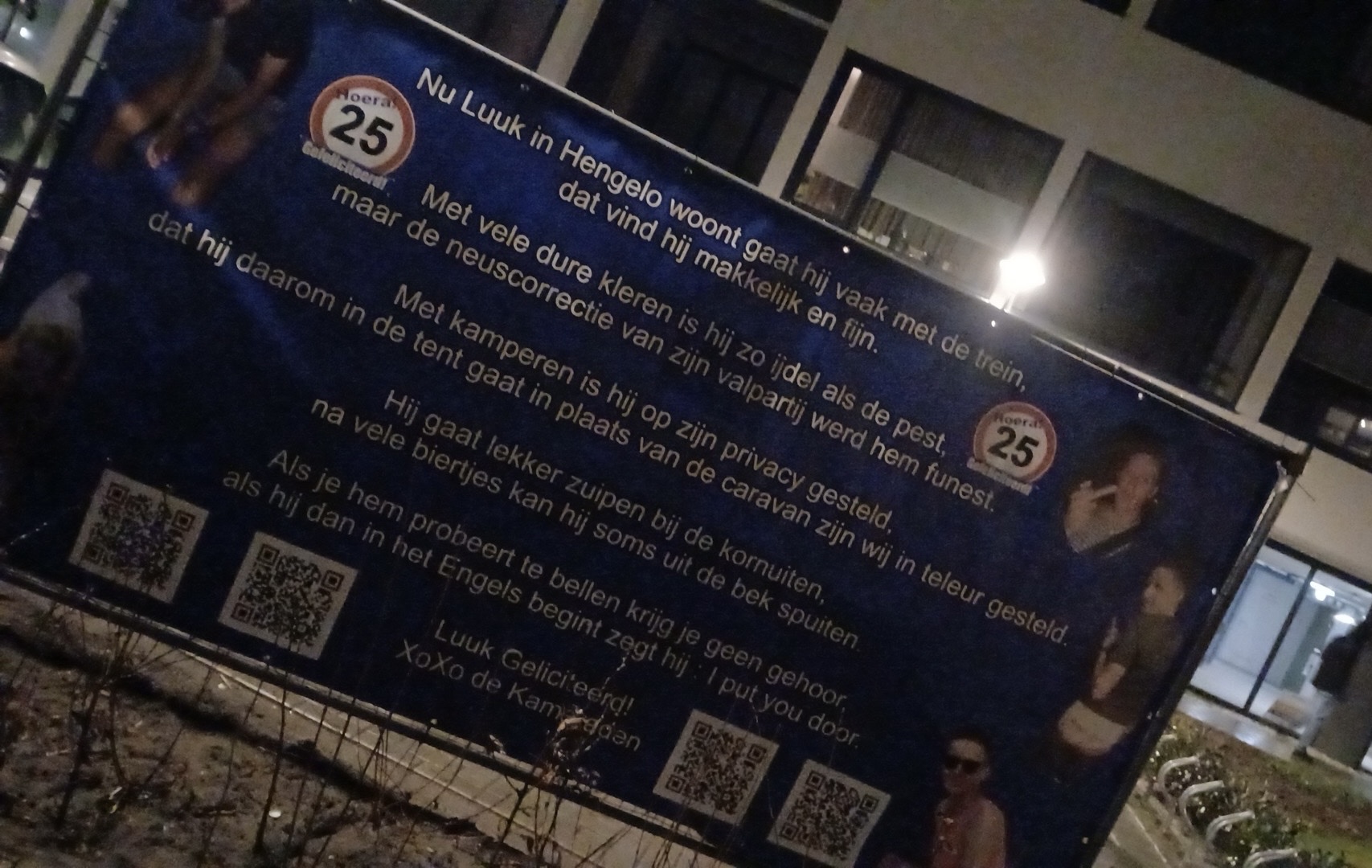 Ter gelegenheid van zijn mijlpaal is een spandoek voor hem geplaatst. Vrienden en bekenden laten daarmee weten dat de kersverse 25-jarige ook in zijn nieuwe woonplaats niet onopgemerkt blijft.