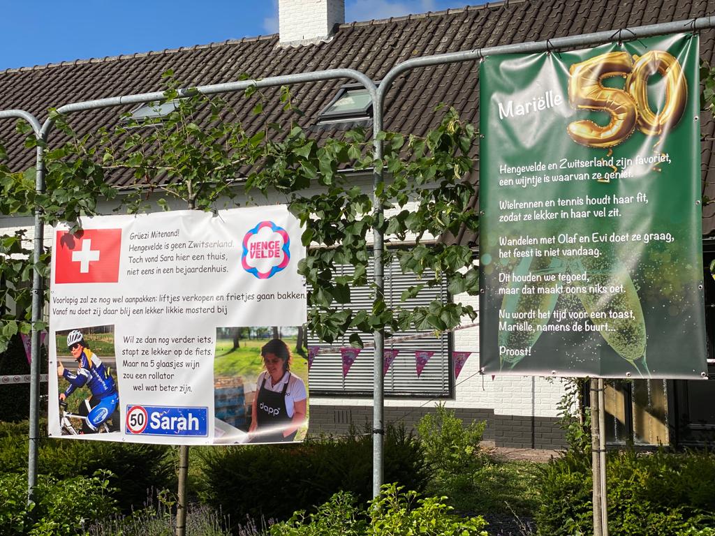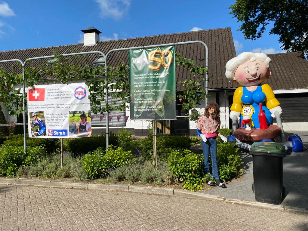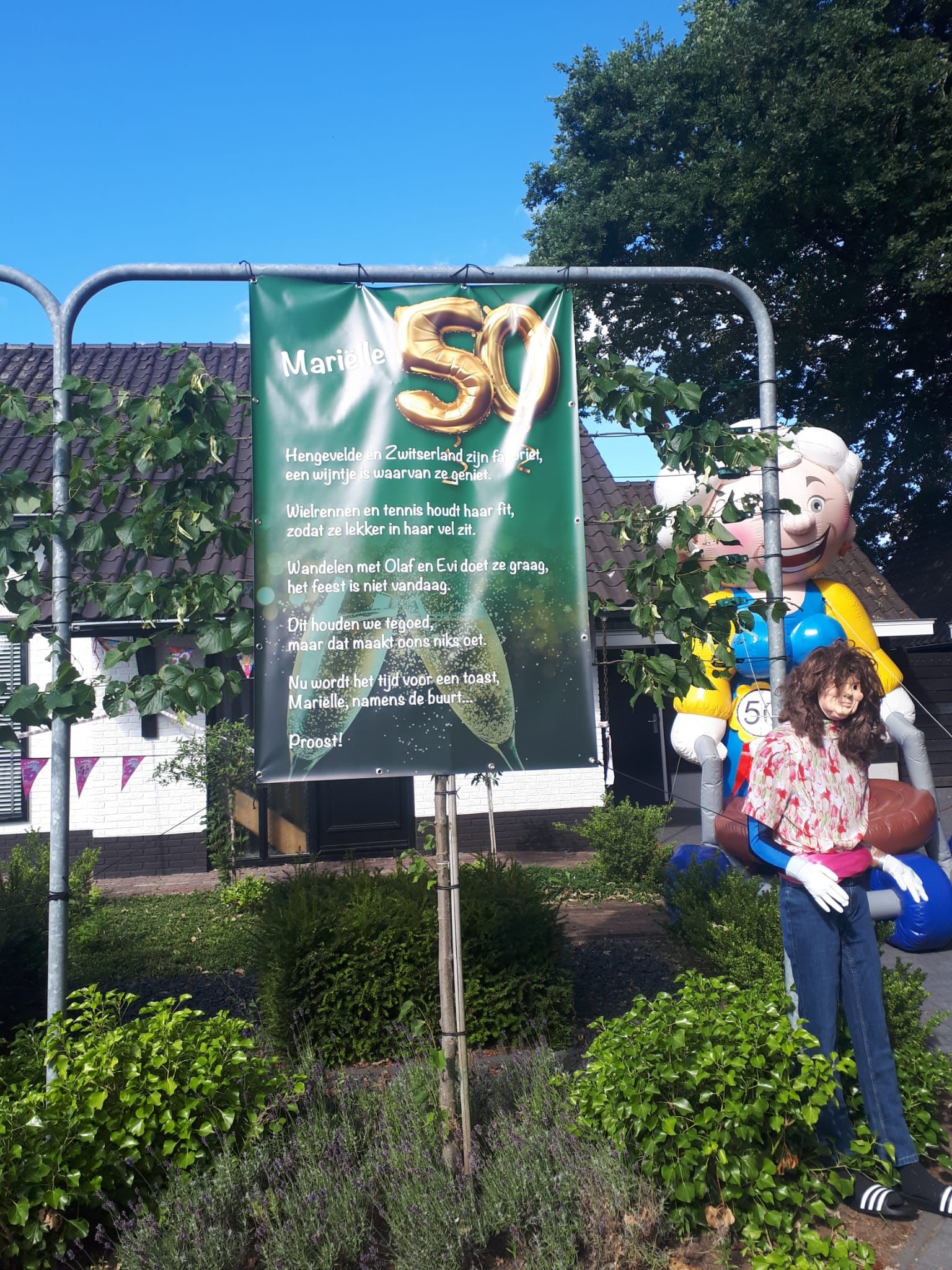 Mariëlle Kroondijk, woonachtig aan de Bekkampstraat in Hengevelde, is 50 jaar geworden! Dat lieten vrienden en de buurt niet onopgemerkt voorbij gaan. Ook namens de redactie van harte proficiat, Sarah! Hieronder nog een foto van de fraaie spandoeken: