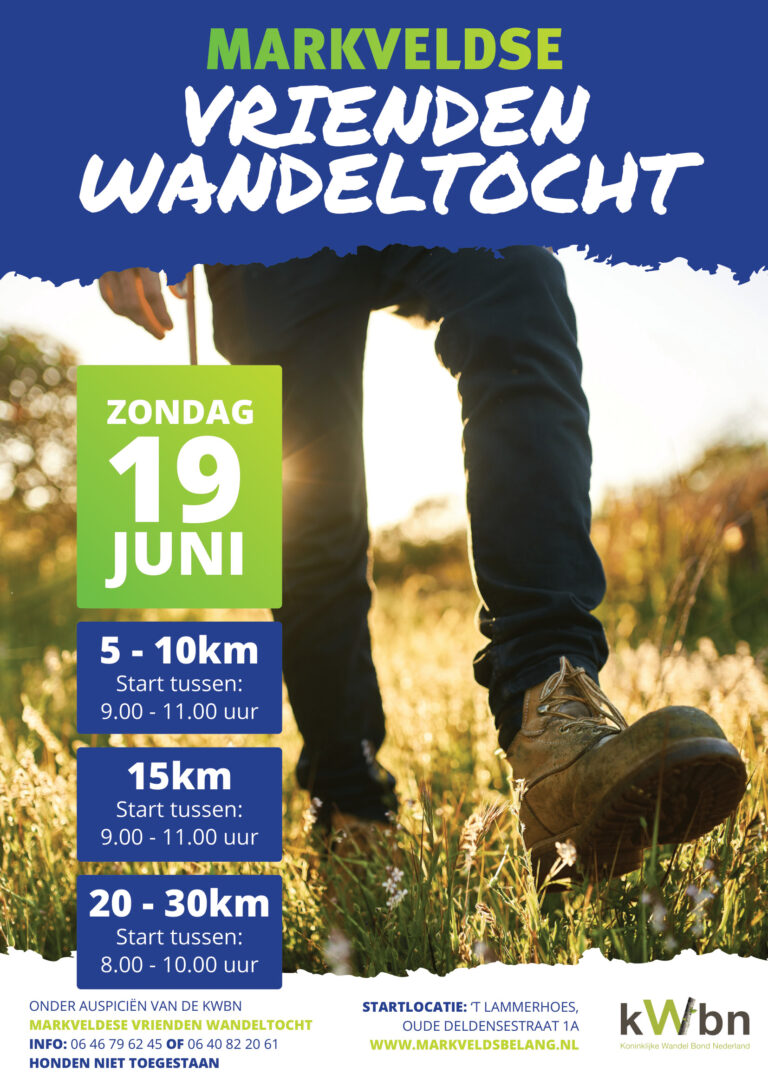 Op zondag 19 juni wordt voor de 5de keer de wandeltocht georganiseerd door een fanatieke groep wandelaars uit Markvelde die ook vaak deel nemen aan wandeltochten, de Kennedymars en de Vierdaagse van Nijmegen. Zij hebben een route uitgezet door onze mooie, landelijke omgeving op de grens van de Achterhoek en Twente. De route is over verharde wegen, bospaden en door prive landschappen die normaal niet toegankelijk zijn voor wandelaars.