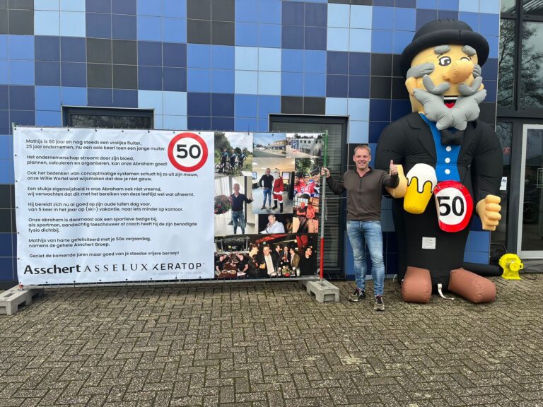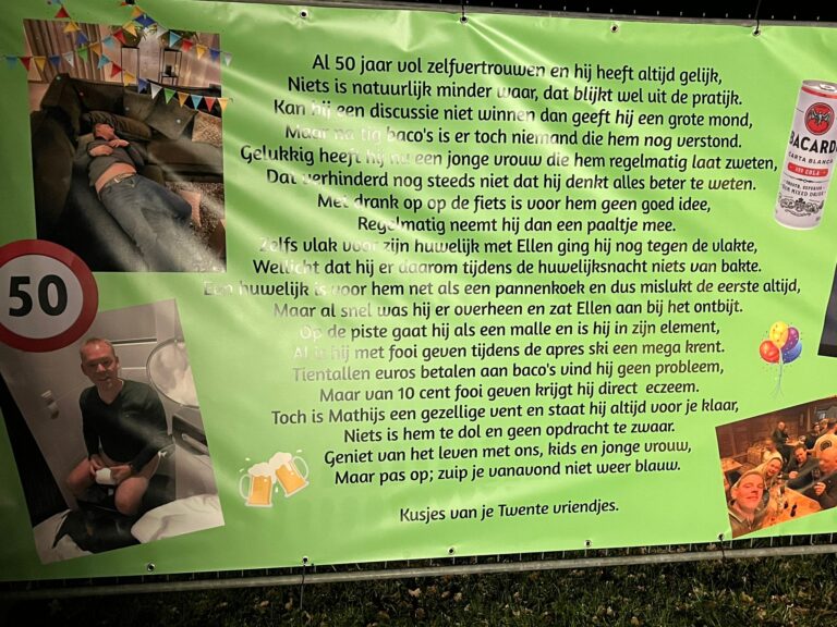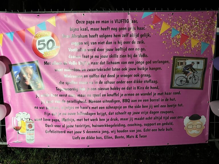 Groot feest aan zowel de Hengeveldse Wiener Benteler Scheidingsweg als in Neede! Matthijs Asschert is namelijk 50 jaar geworden. Vrienden, familie en collega’s lieten dit niet onopgemerkt voorbij gaan, want Matthijs kreeg fraaie spandoeken in zowel de tuin als bij zijn bedrijf. Ook namens de redactie van harte proficiat!