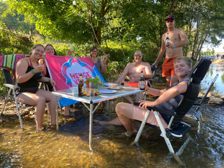 Vorige week was de familie Schreijer al met ‘de vlag op vakantie’ te zien op de Bentelerbult, gelegen naast hun huis aan de Bentelosestraat. Nu zoeken ze het toch maar iets verderop, en wel in met de proem’n in de Prüm, zoals ze het zelf noemen.