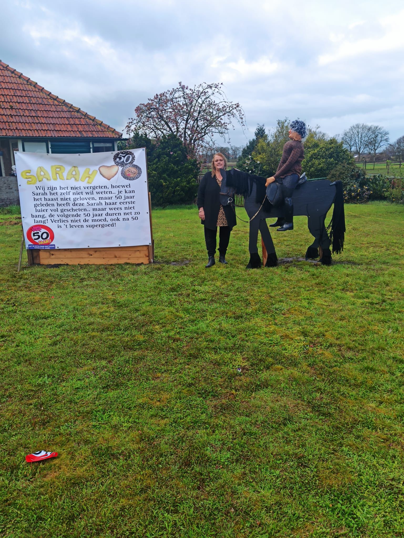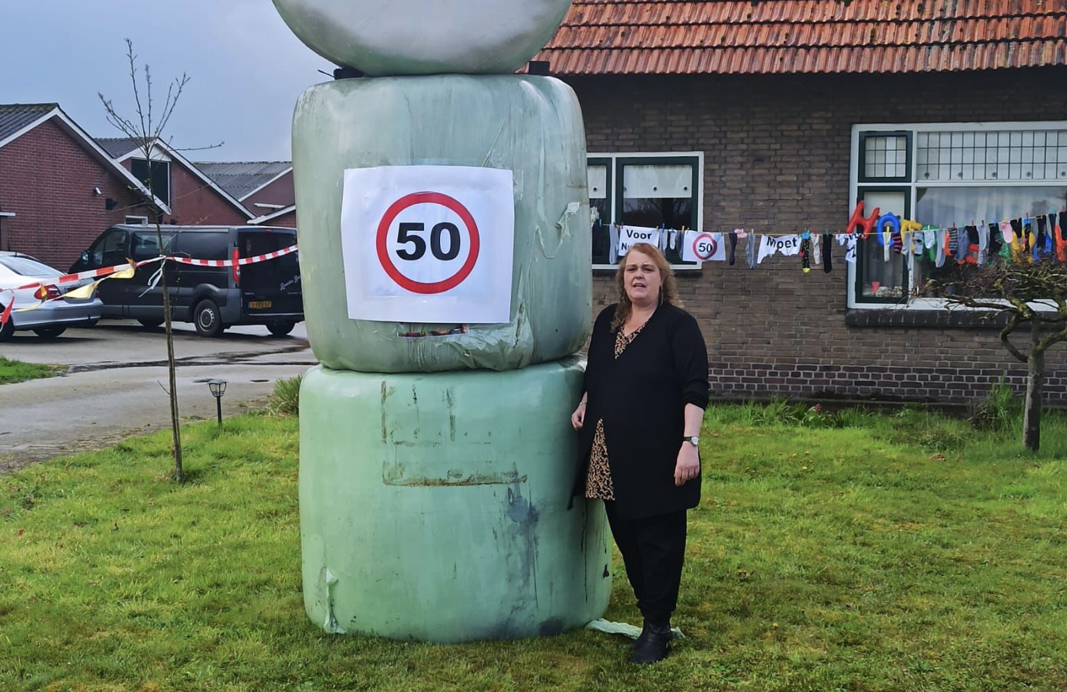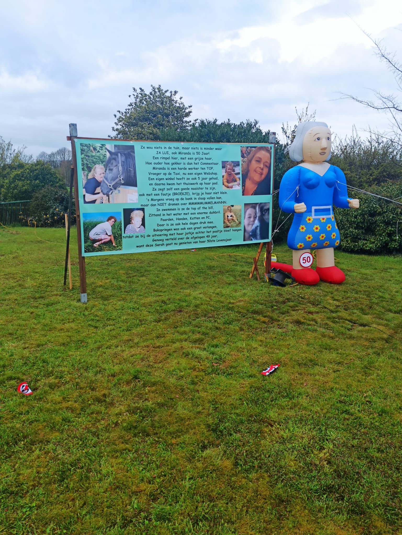“Onze buurvrouw Miranda Lepping, woonachtig met man Jan en dochter Mandy, is donderdag 50 jaar geworden. Wij hebben met de buurt en haar familie diverse Sarah’s in de tuin aan de Haaksbergerstraat gezet.”