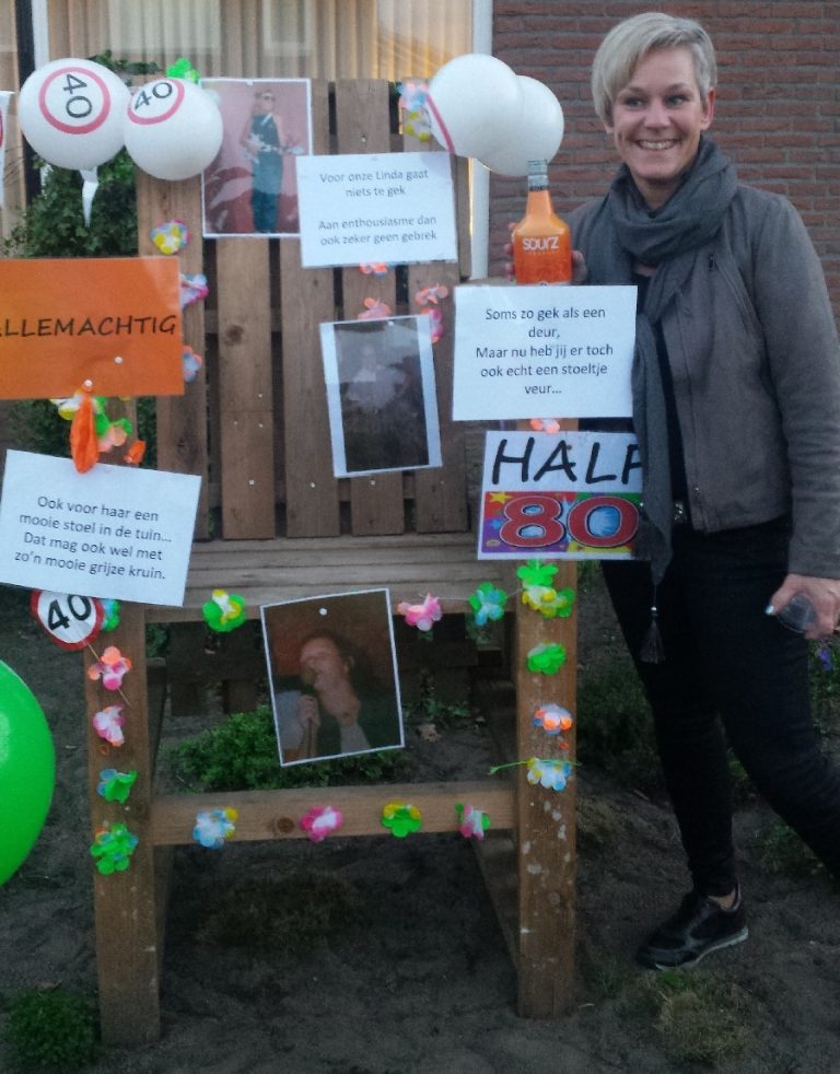 “Nu is nummer 4 aan de beurt” kwam er bij de redactie binnen. Linda Kuenenger die wel van een feestje houdt, bekend van carnavalsvereniging de Höftemennekes en haar jaarlijkse inzamelingsactie voor het ziekenhuis Beregowo Oekraïne heeft nu de stoel in de tuin staan.