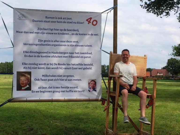 Ramon Doeschot is vandaag, op 16 juni 40 jaar. Reden voor de familie om een mega stoel en spandoek te plaatsen.