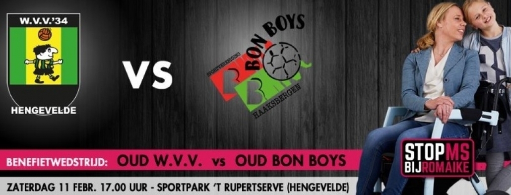 Aanstaande zaterdag wordt op sportpark Rupert's erve de benefietwedstrijd voor stichting www.STOPMSBIJROMAIKE.nl gespeeld. Deze wedstrijd tussen oud WVV'34 en oud Bon Boys start om 17.00 uur. Aansluitend zal er vanaf 18.30 uur een reünie voor Hengeveldenaren, Haaksbergenaren en overige betrokkenen zijn in de kantine. De opbrengst hiervan zal ook gedoneerd worden aan www.STOPMSBIJROMAIKE.nl. Meer info over het goede doel is te vinden op www.STOPMSBIJROMAIKE.nl en over de benefietwedstrijd op www.facebook.com/wvvbonboys. De teller staat inmiddels op meer dan 50.000 euro, daar waar 75.000 nodig is om de behandeling voor Romaike mogelijk te maken.