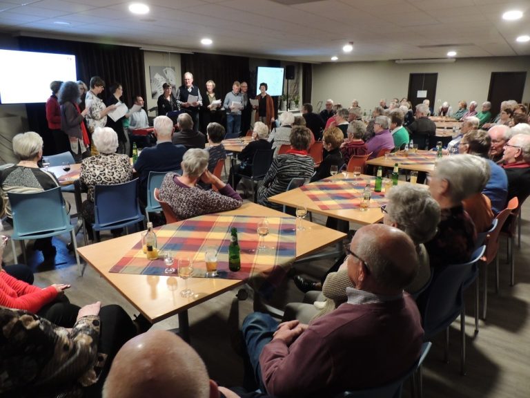 Twee dames uit Hengevelde, Ans Eshuis en Dinie Vossebeld, vertelden uit eigen ervaring wat ze zo al doen en hoe ze de vele uren aan bed bij de zieke mens doorbrengen. Natuurlijk was het onderwerp deze avond een wat zware emotionele kost. Niemand denkt graag aan die laatste fase van zijn leven. Om dat enigszins te compenseren had het bestuur een aantal koorleden van MiXX bereid gevonden om in de pauze onder leiding van pianist/dirigent Sander Fox een aantal bekende nummers te zingen van Willeke Alberti, Tom Manders en Win Sonneveld, e.a. Herkenning van het lied leidde al snel tot enthousiast meezingen met het gelegenheidskoortje. Uiteraard werden de dames Pietie en Ine na afloop bedankt met een bloemetje. En omdat Ans en Dinie dit jaar al 10 jaar meedraaien in dit prachtige vrijwilligerswerk, kregen ook zij een bloemetje. Graag herinnerde de voorzitter de leden aan de uitnodiging van de Höftemennekes om vrijdagmiddag 21 februari om 15.00 uur het feest der zotten te komen meevieren in de Gebrande Waateren. Dank ook aan het Markebestuur dat het mogelijk maakte om deze avond en die in de toekomst beelden en teksten duidelijk te kunnen tonen op twee grote tv-schermen. Een grote verbetering voor de conferentiezaal. Meer foto’s vindt u de site van SeniorenHengevelde, klik HIER.
