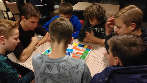 Hier onder een foto van een groepje die bezig is met het bordspel.