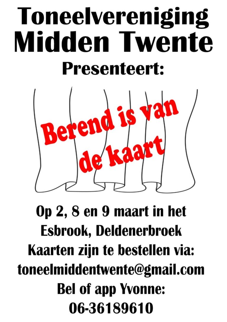 De spelers van Toneelvereniging Midden Twente zijn er weer klaar voor. Op 2, 8 en 9 maart spelen zij het blijspel “Berend is van de kaart”. In dit stuk gaat er natuurlijk weer van alles mis, zijn er misverstanden en is er chaos, wat dan weer resulteert in lachwekkende situaties. Een leuk blijspel wat goed bij Toneelvereniging Midden Twente past.