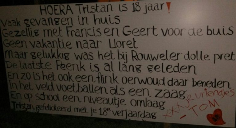 Tristan Peters heeft onlangs de 18 jarige leeftijd bereikt en zijn ‘vrienden’ hebben hem op de bovenstaande wijze laten weten hoe ze over hem denken!