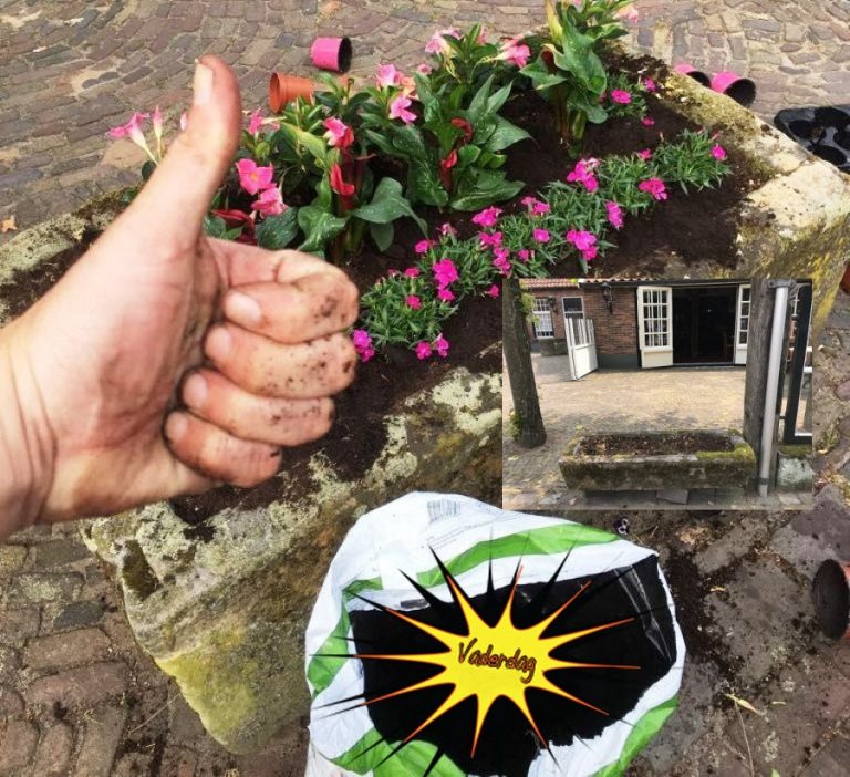 Een aantal vaders uit Hengevelde (Don Wentink/Mathijs Asschert) hebben richting Ans Varenbrink de Vaderdag gedachte omgedraaid. “Ans, dat kan toch zo nig, mon’, hei hier neen bult volk zit’n en dsan hei die bloombak’n der zo bie stoan!”