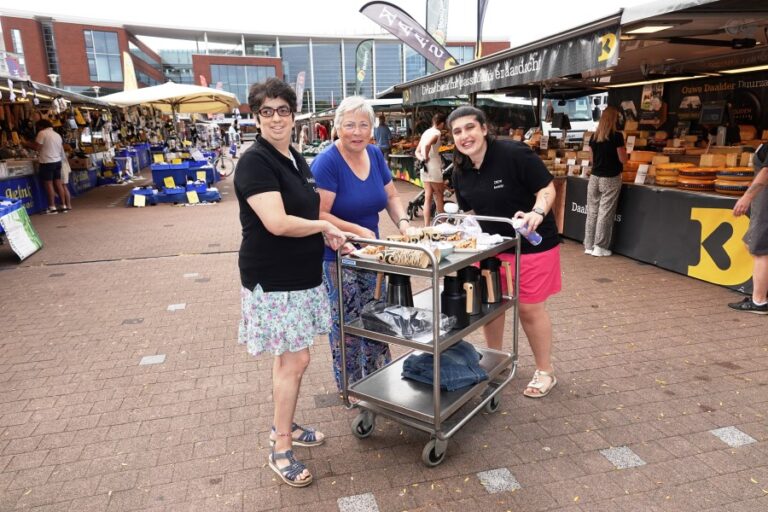 “We doen dit al jaren. Om de beurt gaan er en aantal mee de markt op om alle marktkooplui op de wenken te bedienen. We oogsten daarmee veel waardering. De foyer in de Reggehof is al jaren ene soort van ontmoettingsplek geworden.