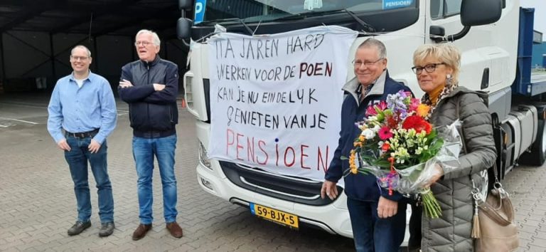 Gisteren heeft de Hengeveldse vrachtwagenchauffeur Leo Rouwenhorst zijn laatste rit gereden voordat hij met welverdiend pensioen is gegaan. Leo werkte jarenlang voor Brink XL in Goor en heeft vele vrachten voor de baas weggebracht. De avond vooraf is zijn vrachtwagen door zijn naaste collega’s versierd en dinsdag is hij door drie collega’s thuis opgehaald. Na een gezamenlijk ontbijt op de bedrijfslocatie in Enter mocht hij als laatste opdracht een vracht lege haspels lossen in Haaksbergen. Daar werd hij ook nog uitgebreid in het zonnetje gezet, hij heeft voor deze opdrachtgever vele jaren zendingen door de Benelux bezorgd.