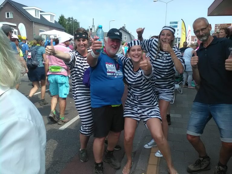 Donderdag was de derde dag van de Nijmeegse Vierdaagse en tevens de dag van de beruchte Zevenheuvelenweg. Vandaag hebben de lopers de finish in zicht, want bij aankomst wacht de Via Gladiola. Het wordt vrijdag bij de intocht van de Nijmeegse Vierdaagse wel enorm heet. Op de Via Gladiola lopen de temperaturen in de middag op tot 28 of 29 graden. Er staat geen wind en er is amper bewolking. Rob Geerlings is nog altijd positief gestemd, hij heeft de drie dagen al doorstaan: "Het weer werkte volledig mee, hierdoor iedereen blij, nou ja bijna iedereen blij. Onderweg geen bekenden gezien. Wel het goede bericht dat Ik Erna Sterrenburg de derde dag goed gestart was. De dag van the Dutch Mountains was goed te doen. De aanloop van Mook naar Groesbeekblijft blijft altijd pittig en lang. Het onthaal van de wandelaars in Mook, Groesbeek en Berg en Dal was overweldigend. Heel veel mensen langs de jant dat beloofd nog wat morgen. Onderweg goede muziek van deejays die de sfeer verhoogden. Veel muziek- en dweilorkesten uit binnen en buitenland. In Groesbeek wilden de dames me nog een nachtje vastzetten. Het leuke van de foto is ook nog dat de foto is gemaakt door een politieagente (een echte) De gevreesde Zevenheuvelenweg snel afgewerkt door aan te haken aan een groep mariniers. Adreline volop door de kreet Push, Push let getting a bit harder en dat zo'n 1000 maal herhalen. Vrijdag gelukkig de slotdag." Alfons Assink is met zijn loopmaatjes ook nog altiljd in de strijd. Hij stuurde onderstaande foto in: