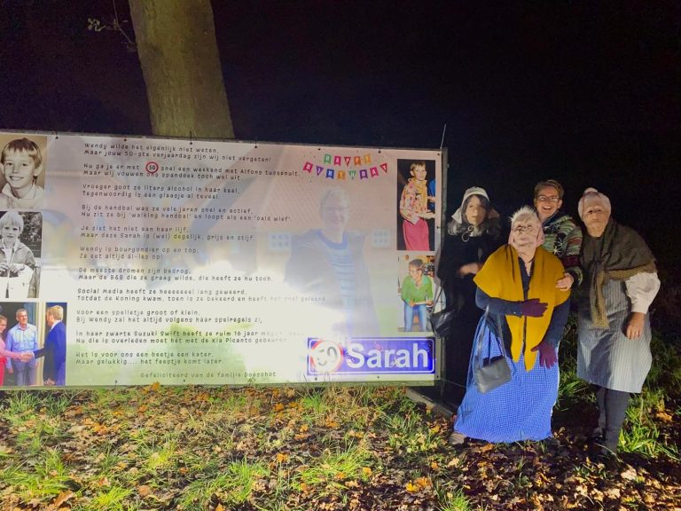 Wendy Doeschot wordt 50 jaar, en daarom is er een spandoek voor haar gezet en kwamen een aantal Sarah’s op verjaardagsvisite.