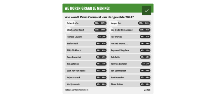 Het is de vraag die Hengevelde al weken in zijn greep houdt. Wie wordt vanavond verkozen tot nieuwe Prins Carnaval van CV De Höftemennekes voor het carnavalsjaar 2024. Diverse namen doen de ronde en een naam die al jaren op het lijstje stond bij velen, prijkt nu bovenaan in de peilingen: Brian Grefte. Maar we hebben dit jaar ook een outsider die op verrassend veel stemmen kan rekenen, niemand minder dan Kasper Put. Hij staat het al al op het podium van de Revue, dus wellicht speelt hij mee in het bekendmaken van….. zichzelf.