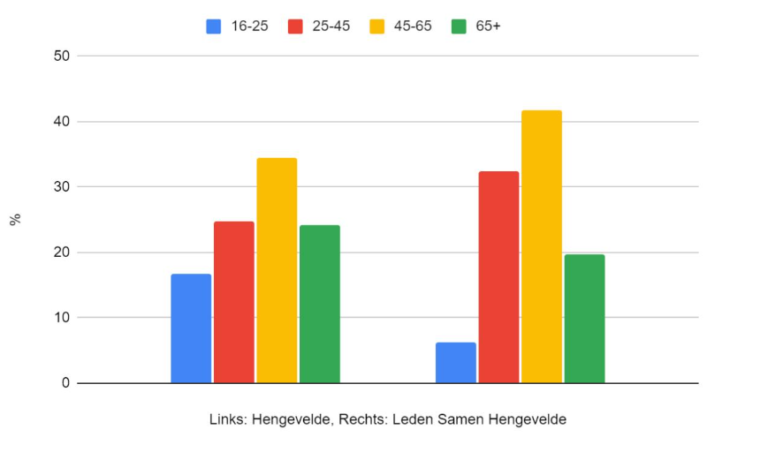 Hieronder zie je de verdeling van de leeftijdsgroepen in Hengevelde en de verdeling van de leeftijdsgroepen van de leden van de Dorpscoöperatie. We zien dat vooral de jongste groep nog ondervertegenwoordigd is. Jammer, want de jeugd is ook hier de toekomst! Meld je dus aan en laat je stem horen!