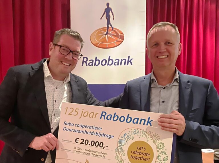 Andre Kolner en Mark Tuinte van de Stichting Sport- en Gemeenschapsvoorzieningen Hengevelde (SSGH) kregen gisteravond een cheque overhandigd door Robin Geerdink (directeur Rabobank Centraal Twente) ter waarde van maar liefst €20.000,-. Andre Kolner, penningmeester SSGH: ”Het grootste bedrag ging vanavond naar Hengevelde. Een mooie opsteker en een zeer welkome bijdrage die we gaan gebruiken voor de MFA”.