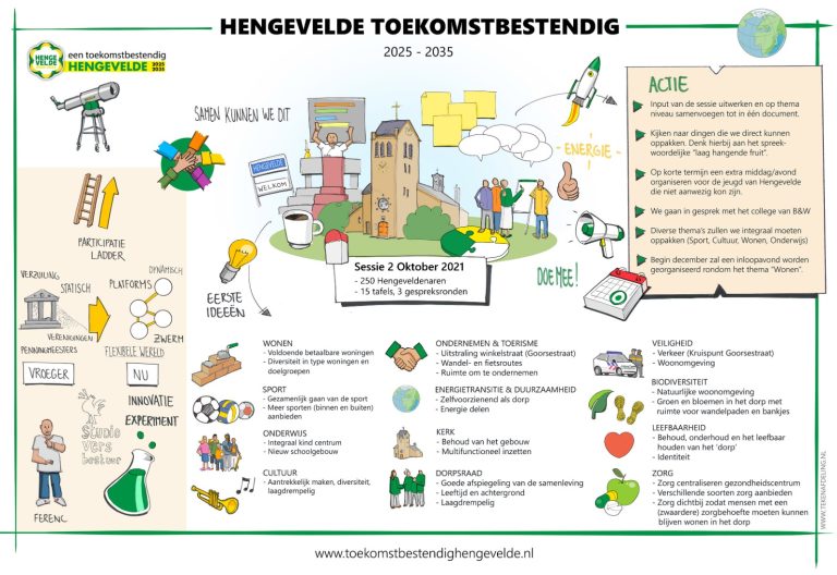 De eerste stap die we de afgelopen weken hebben gezet is de input van de sessie van zaterdag 2 oktober uitwerken en op thema niveau samenvoegen tot in één document. Het document wordt via deze website en www.toekomstbestendighengevelde.nl met heel Hengevelde gedeeld. We hebben er voor gekozen om de volledige input van deze middag in één uitgebreid document samen te voegen. We hebben bewust geen samenvatting/conclusie gemaakt omdat deze zou kunnen bijdragen aan onbedoelde beeldvorming. Wel hebben we per thema de uitslag van de mentimeter (app die wordt gebruikt om presentaties te maken met realtime feedback) via een tagcloudtoegevoegd. Hierin wordt direct zichtbaar waar voor Hengeveldenaren de prioriteit ligt en waarin we met elkaar een uitgesproken (of niet) mening hebben. Zowel uit de mentimeterals uit de evaluatie van de tafelgesprekken kwam naar voren dat in Hengevelde veel consensus is over de meeste thema’s.