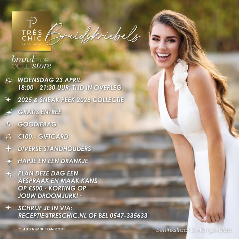 Ben jij verloofd en op zoek naar dé perfecte trouwjurk? Dan is er goed nieuws! Op woensdag 23 april organiseert Très Chic Bridal Wear de bruisende bruidsbeurs Bruidskriebels. Dit evenement biedt niet alleen een exclusieve sneak peek van de 2026 trouwjurkencollectie, maar ook tal van extra’s voor toekomstige bruiden.