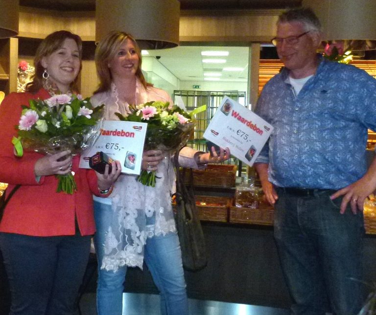 Op de foto zie je Ester ten Hoff en Andrea ter Laak (beide uit Hengelo), zij ontvangen de eerste prijs uit handen van Vincent Nollen.