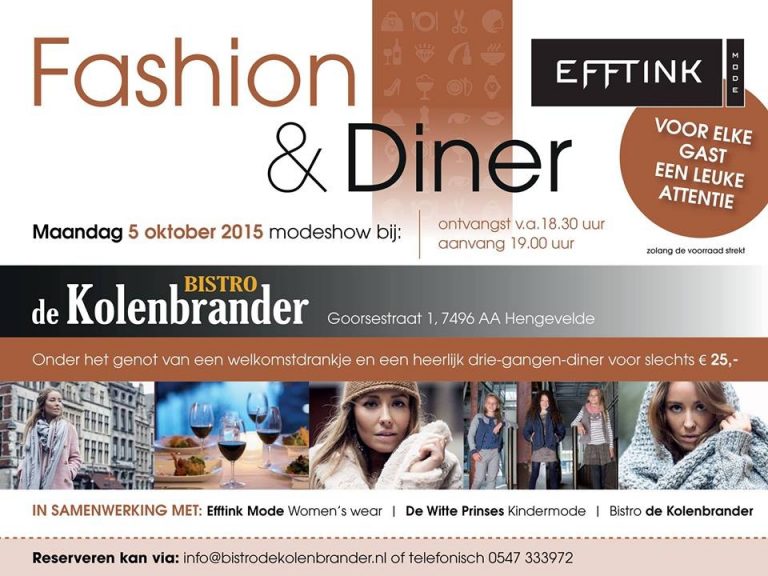 Bistro de Kolenbrander organiseert in samenwerking met Efftink Mode Women's Wear & De Witte Prinses Kindermode een Fashion & Diner Show. Laat je inspireren door de laatste trends op modegebied en geniet van een culinair driegangendiner. De reserveringen stromen lekker binnen, maar ze hebben nog aantal tafeltjes vrij. Reserveer voor Fashion & Diner bij Bistro de Kolenbrander. Onder het genot van een welkomsdrankje en een heerlijk driegangendiner kunt u genieten van de laatste trends op modegebied. Reserveren kan via [email protected] of telefonisch door te bellen naar 0547-333972. Fashion & Diner wordt georganiseerd in samenwerking met Efftink Womens Wear en De Witte Prinses Kinderkleding.