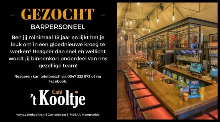 Wij zijn per direct op zoek naar nieuwe barmedewerkers. Ben jij minimaal 18 jaar en op zoek naar een uitdaging in de horeca? Heb jij zin om om in een gloednieuwe kroeg te werken? Stuur dan snel een berichtje en wie weet wordt jij binnenkort onderdeel van ons gezellige team! Reageren kan via 0547-333972 of Facebook!