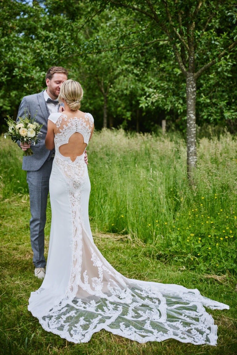 De trouwjurk, geïnspireerd door het combineren van unieke elementen van verschillende ontwerpen, was gemaakt met zachte crêpe-georgette, delicate geborduurde kanten applicaties en lagenvan huidkleurige panelen om de jurk mooi flatterend te maken. Terwijl de jurk was ontworpen om nogal simplistisch aan de voorkant te zijn, onthulde de achterkant van de jurk een verrassend detailniveau dat op zich al uniek was. De achterkant onthulde een prachtig “kathedraalvormig” open paneel, afgewerkt met delicate kanten rand en prachtige applicaties. De lagere ‘back and train’ zette het thema voort met majestueus gehoekte vormen en pure panelen. Het contrast tussen de voorkant en de achterkant van de jurk was een prachtige synergie van eenvoudig en dramatisch ontwerp, en die twee elementen samen creëerde een trouwjurk die adembenemend was.En alsof dat nog niet genoeg was, trok Amber voor de avond een tweede “feestjurk” aan.
