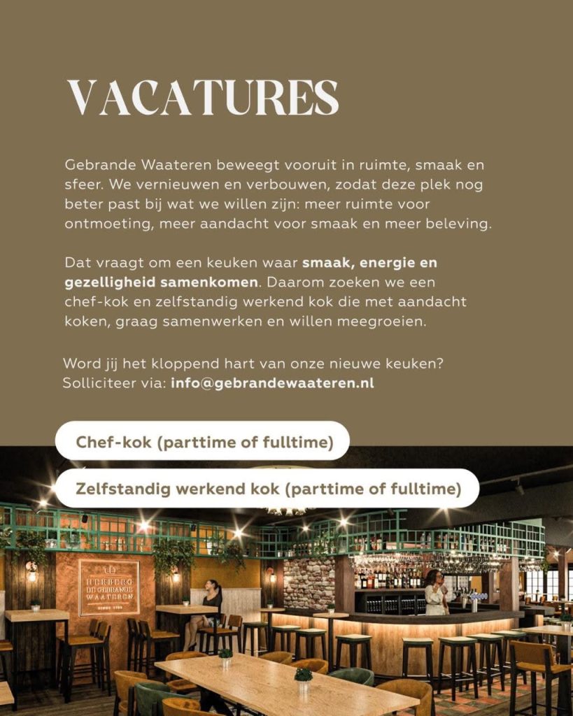 Bij Gebrande Waateren koken we voor momenten die blijven hangen. Voor tafels vol verhalen, gedeelde gerechten en gasten die terugkomen omdat het gewoon klopt. Dat vraagt om een keuken waar smaak, energie en gezelligheid samenkomen. Daarom zoeken we een chef-kok en zelfstandig werkend kok die met aandacht koken, graag samenwerken en willen meegroeien met een plek die volop in beweging is en klaar is voor de volgende stap.