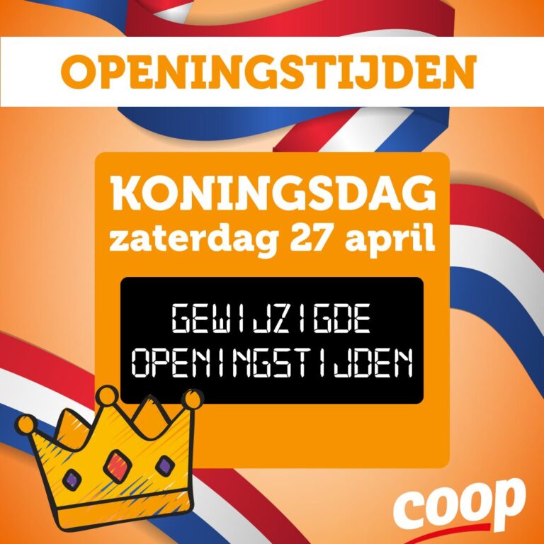 Het is zaterdag Koningsdag. Coop Hengevelde heeft daarom gewijzigde openingstijden. Houd er rekening mee dat zij deze dag van 8.00 tot 17.00 uur geopend zijn.