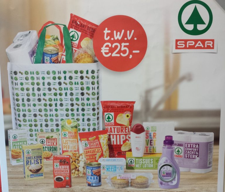 Bij elke €10,- aan boodschappen ontvangt de consument een stempel. Met 40 stempels is de spaarkaart vol en ontvangt men een coupon waarmee de tas vol boodschappen t.w.v. €25,- op vrijdag 31 oktober of zaterdag 1 november bij de winkel opgehaald kan worden. De spaarkaart hoeft niet perse vol te zijn om gratis boodschappen te ontvangen. Bij 10, 20 of 30 stempels ontvangt de consument het product dat bij dit aantal stempels op de spaarkaart vermeld staat. Extra win-actie Op de spaarkaart kan de klant zijn of haar contactgegevens invullen. Bij inlevering van de spaarkaart, en dat hoeft niet eens een volle spaarkaart te zijn, maakt men kans op een unieke SPAR zitzak t.w.v. € 150,-! Deze populaire zitzakken staan vrolijk in ieders huis en zitten erg comfortabel. De spaarkaarten kunnen t/m 12 oktober ingeleverd worden. De winnaar wordt op zaterdag 11 oktober bekend gemaakt.