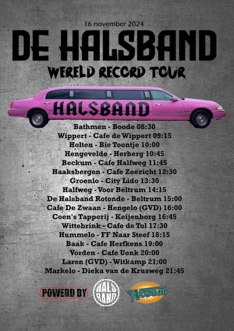 Halsband gaat namelijk voor de wereldrecord Tour. Halsband hierover: “Hier is die dan! Onze tour waarmee we de geschiedenis boeken ingaan. Zie hier de tijdsplanning voor aanstaande zaterdag. Zoals jullie kunnen zien is de planning heel strak net als… ach laat ook maar.