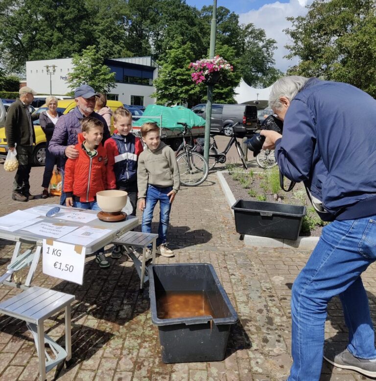 Maandag kondigden we op deze website aan dat aardappelboeren Siem Pierik en gebroeders Sjaak en Kees Rupert op het kerkplein zouden staan met aardappelen die door hunzelf gerooid zijn. Die boodschap bleek niet aan dovemansoren gericht. Binnen 20 minuten waren de mannen ‘glad uitverkocht’. 80 kilo ging over de toonbank en het spaarcentje voor de Zomerfeesten was binnen.