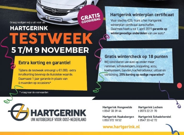 Wintertijd! In de testweek van garage Hartgerink liggen er voor de autorijders vele mogelijkheden om de heilige koe winterklaar te krijgen. Een gratis wintercheck met controles op 18 punten, voor slechts 25 euro ontvangt u een winterplan certificaat waarmee u garantie krijgt op wintergevoelige onderdelen.