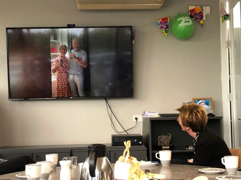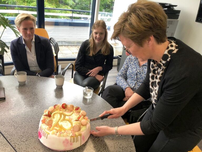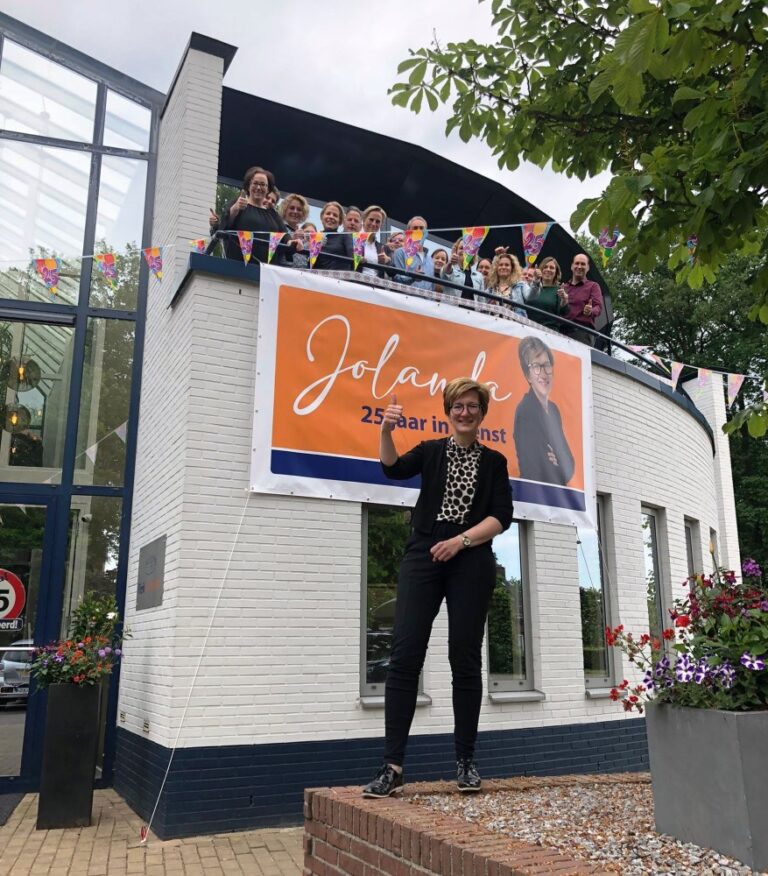 De collega’s van Jolanda hebben haar daarom vandaag alvast in het zonnetje gezet. Een groot doek siert het kantoorpand en een prachtige jubileumtaart werd aangesneden bij de koffie. Hierbij werd een filmpje getoond met felicitaties en lovende woorden van klanten en collega’s. Donderdag zal er feest worden gevierd en staan er Jolanda nog meer verrassingen te wachten.