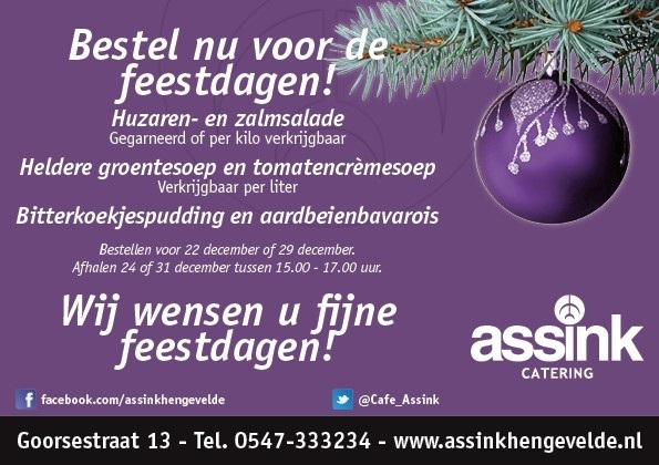 Net als elk jaar is het weer mogelijk om uw feestmaal thuis compleet te maken met een lekkere salade, soep en/of bavarois van Eet- en Biercafé Assink. U heeft de keuze uit huzaren- en zalmsalade, rijkelijk gegarneerd of per kilo (niet gegarneerd). Daarnaast kunt u tomaten- en groentesoep per liter bestellen en aardbeienbavarois en/of bitterkoekjespudding per stuk. Bestellen kan door te bellen naar 0547-333234 of door een mail te sturen naar [email protected]. Wij wensen u allen alvast hele fijne en smakelijke dagen en een fantastisch 2017!