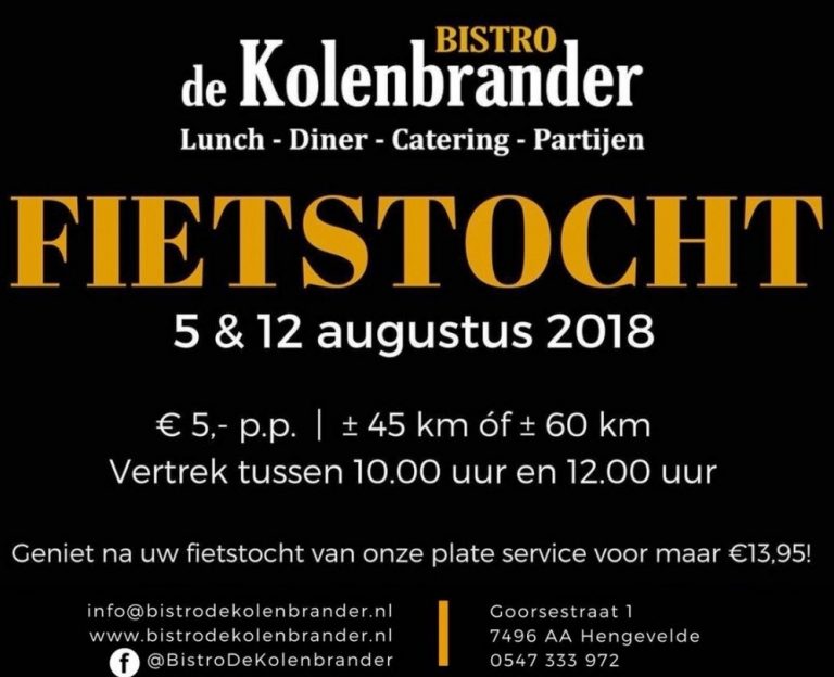 Deze zondag schijnt de zon weer volop, het blijft droog en komt de zon vaker tevoorschijn tussen de wolkenvelden door. Een ideaal fietsweertje voor jong en oud dus. Morgen kunt u weer starten tussen 10.00 en 12.00 uur, dan organiseert Bistro de Kolenbrander weer de jaarlijkse fietstocht. Deze 12e augustus kunt u voor maar €5,- p.p. een uitgestippelde route volgen door de schitterende Twentse landschappen. Sem Kuipers:” Vorige week hadden we 138 fietsers. Ze fietsen morgen wederom door de mooiste plekjes uit de regio, en kunnen na de tijd afsluiten bij ons met een drankje en plate service of à la carte eten, iedereen was zeer tevreden afgelopen zondag!”.